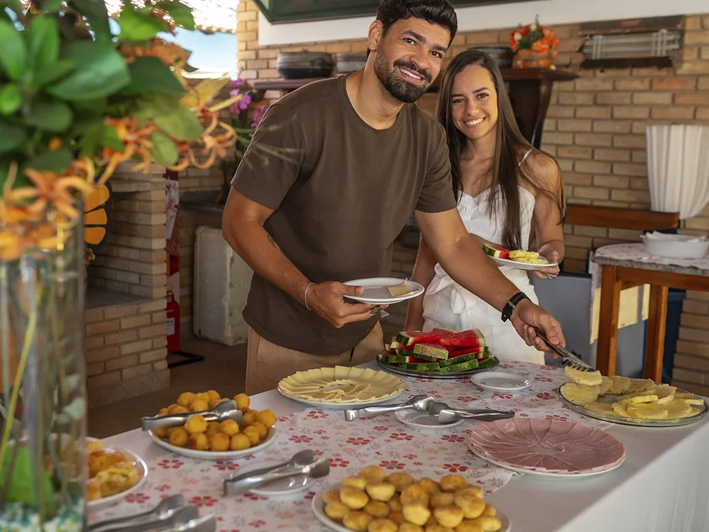 Sua diária inclui um café da manhã completo, com itens que valorizam a culinária baiana, trazendo sabor e energia para começar bem o dia..
